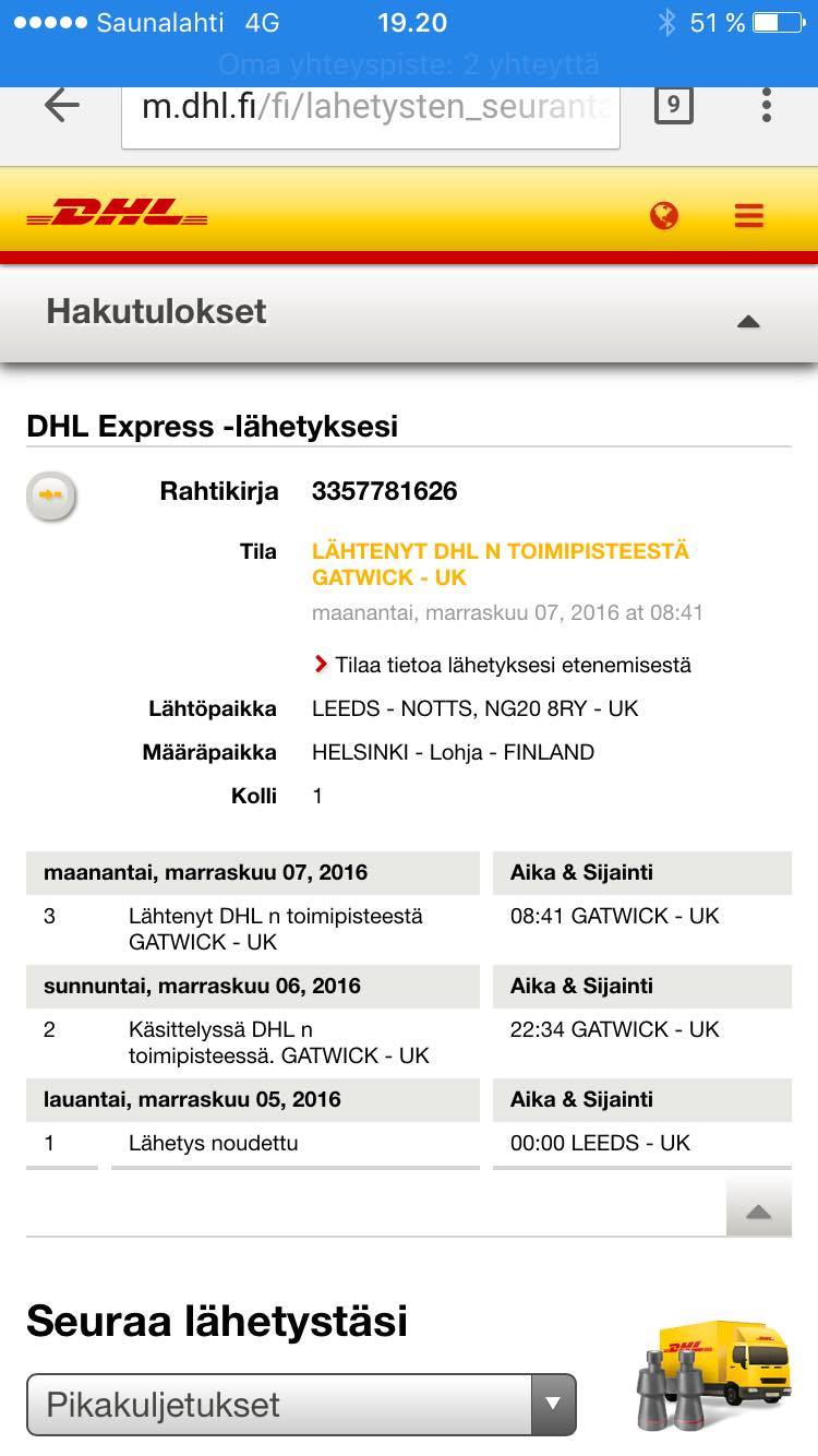 Eve kirjoitti:7.11 aamusta asti GATWICK - UK eikä ole tun jälkeen mitään merkintää että olisi paktti liikkunut mihinkään