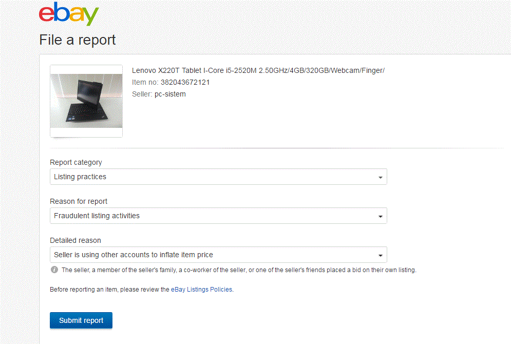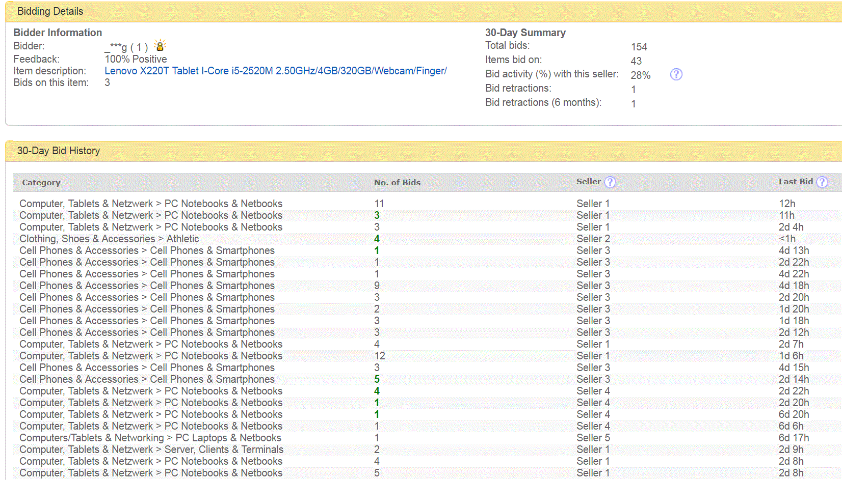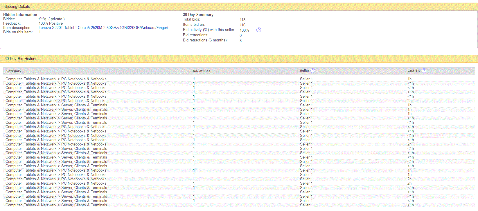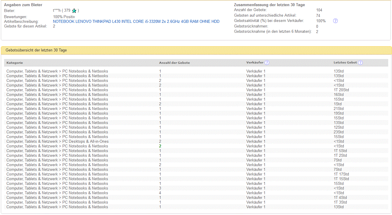 Seurailin vähän tilannetta ja heittelin muutaman tarjouksen. Kauppojen sulkeuduttua tarjouslistasta kävi ilmi että ensiksi joku palautteensa piilottanut l***i (privat) oli huudellut Itscon kohteita sellaiseen tahtiin, että ei varmasti ole kerennyt perehtyä sellaisella tarkkuudella jota voisi olettaa jos joku tekee tarjouksen kymmenestä käytetystä läppäristä. Tarjoukset olivat jonkin verran alle odotetun kauppahinnan, eli eivät johtaneet kauppoihin. Useasti l***i on myös korottanut omaa tarjoustaan.