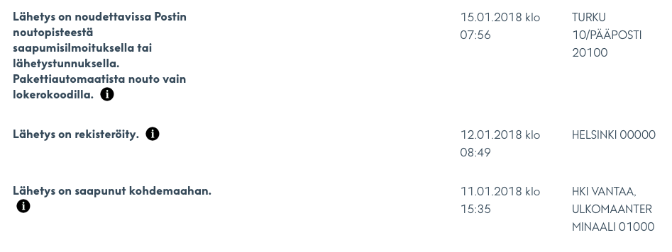 Paketti lähti Kiinasta, jossa se selvisi lähettäjältä lentokoneeseen kahdessa päivässä, prosessin pitäisi olla melkolailla sama, mutta eri järjestyksessä.Pari sataa pakettia varastettiin Tampereella: "Posti ei valitettavasti korvaa ulkopuolisen aiheuttamaa tuhoa"