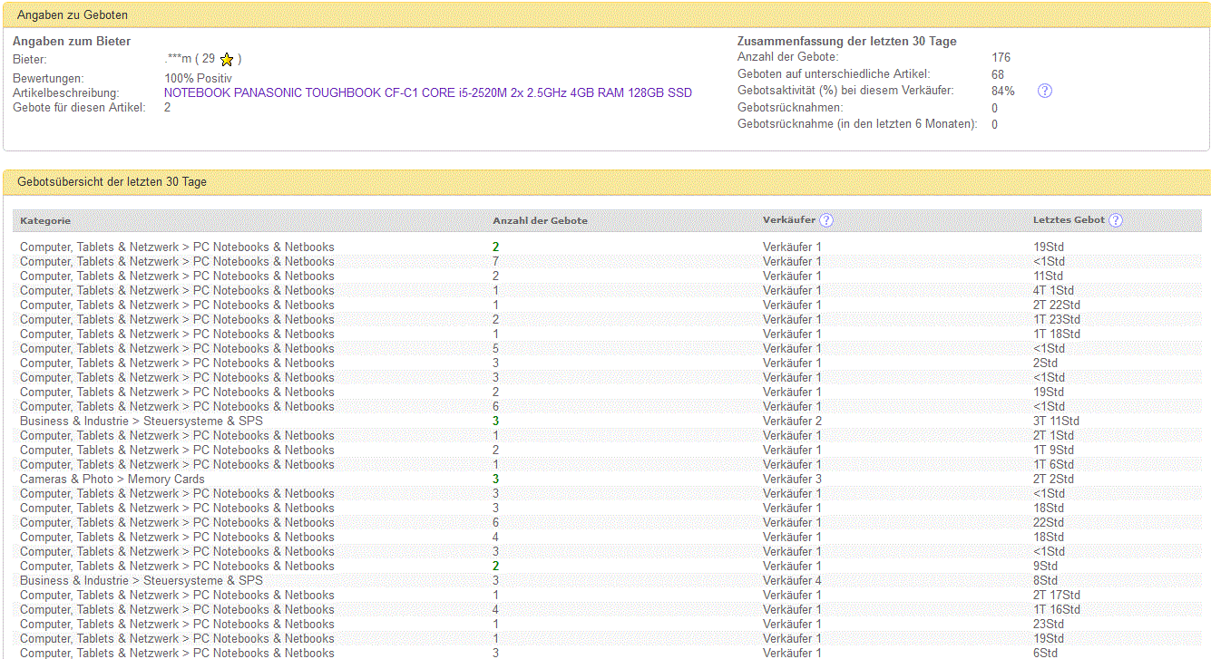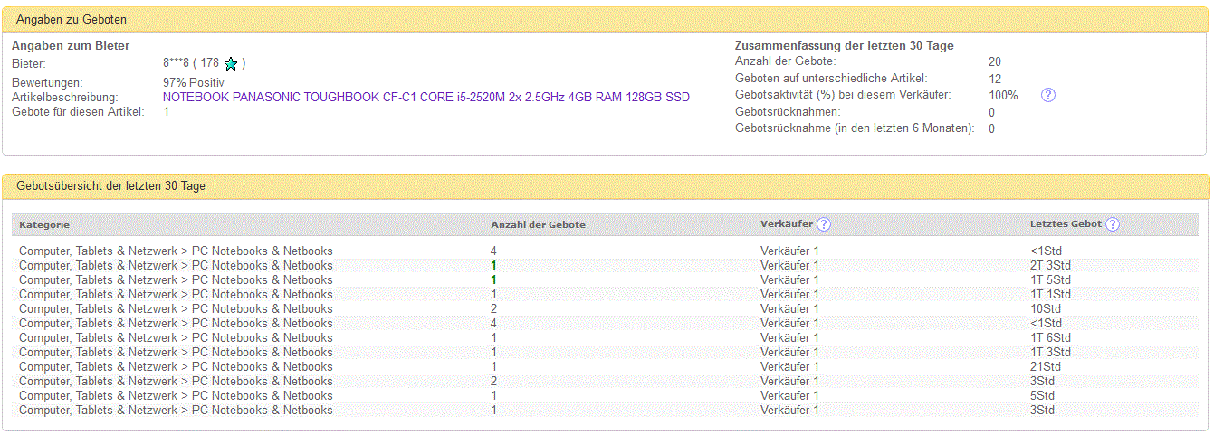 Seurailin vähän tilannetta ja heittelin muutaman tarjouksen. Kauppojen sulkeuduttua tarjouslistasta kävi ilmi että ensiksi joku palautteensa piilottanut l***i (privat) oli huudellut Itscon kohteita sellaiseen tahtiin, että ei varmasti ole kerennyt perehtyä sellaisella tarkkuudella jota voisi olettaa jos joku tekee tarjouksen kymmenestä käytetystä läppäristä. Tarjoukset olivat jonkin verran alle odotetun kauppahinnan, eli eivät johtaneet kauppoihin. Useasti l***i on myös korottanut omaa tarjoustaan.